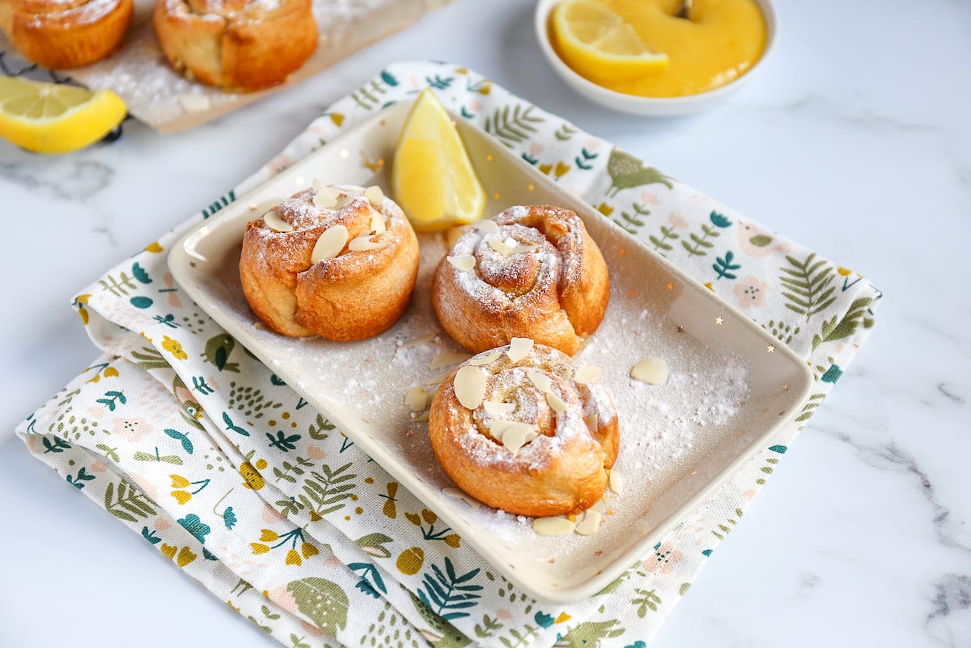 Verwarm de oven voor zoals op de verpakking van het croissantdeeg staat. Rol het croissantdeeg uit en druk de gestippelde randjes aan met je vinger. Besmeer het deeg met lemon curd en wat amandelschaafsel. Rol het deeg op vanaf de lange zijde op en snijd in plakken van circa 2 cm dik.