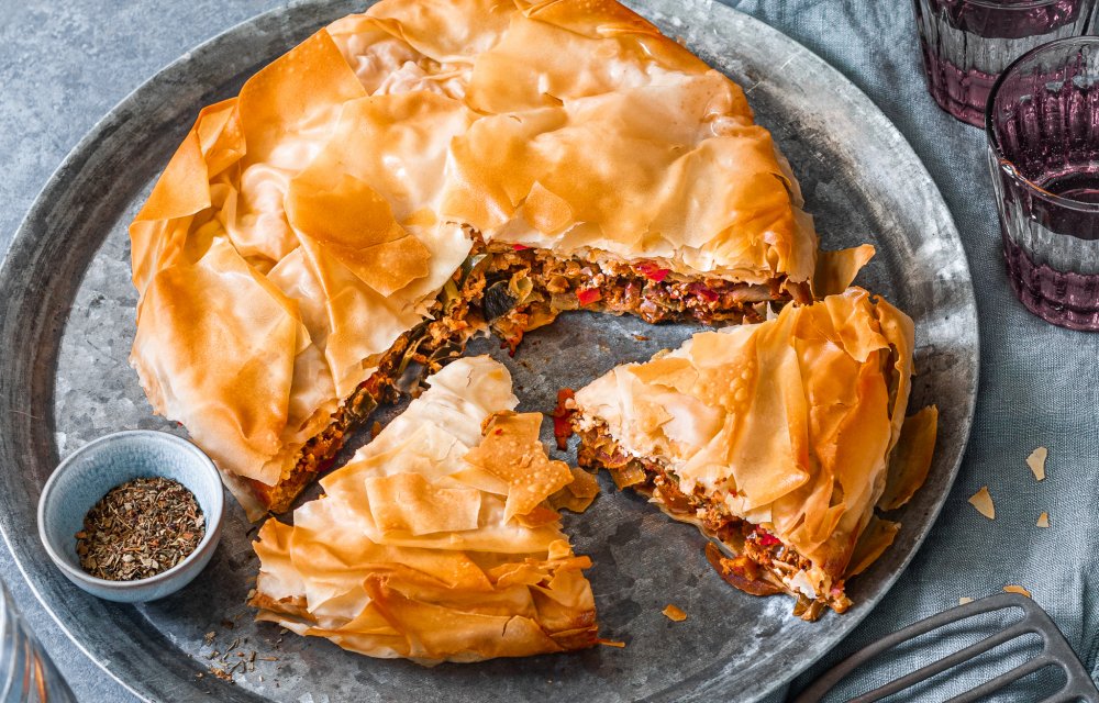Vet een springvorm (wij gebruiken een vorm van 24 centimeter) in met wat olie en leg een vel filodeeg op de bodem. Leg vervolgens een vel filodeeg met één punt in het midden op de bodem, zodat ongeveer de helft van het vel over de rand hangt. Herhaal dit met 5 vellen, totdat de rand van de springvorm helemaal bedekt is.