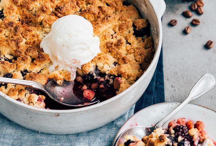 Serveer de kersen crumble met vanille ijs en eventueel slagroom.