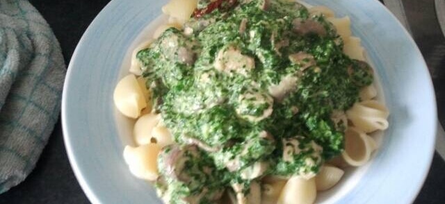 Roerbak het en kook het nog even enkele minuten. Vervolgens kun je de spinazie toevoegen. Voeg ook de roomkaas toe aan het geheel en schep het zachtjes om. Herhaal dit proces gedurende een minuutje. Voeg tot slot nog de zongedroogde tomaatjes en de geroosterde pijnboompitten toe.