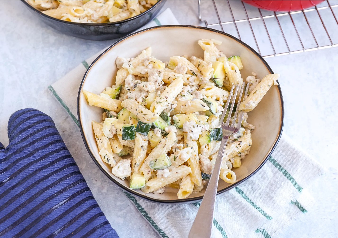 Giet een scheutje olie in een pan en bak het gehakt rul met een snufje zout en peper. Voeg daarna de ui, paprika, courgette, knoflook en kruiden toe en bak dit een minuut of 5. Vervolgens kan de room erbij en laat je het geheel nog 5 minuten pruttelen. Voeg een hand geraspte kaas toe, meng alles door elkaar en als de kaas gesmolten is, zet je het vuur uit.