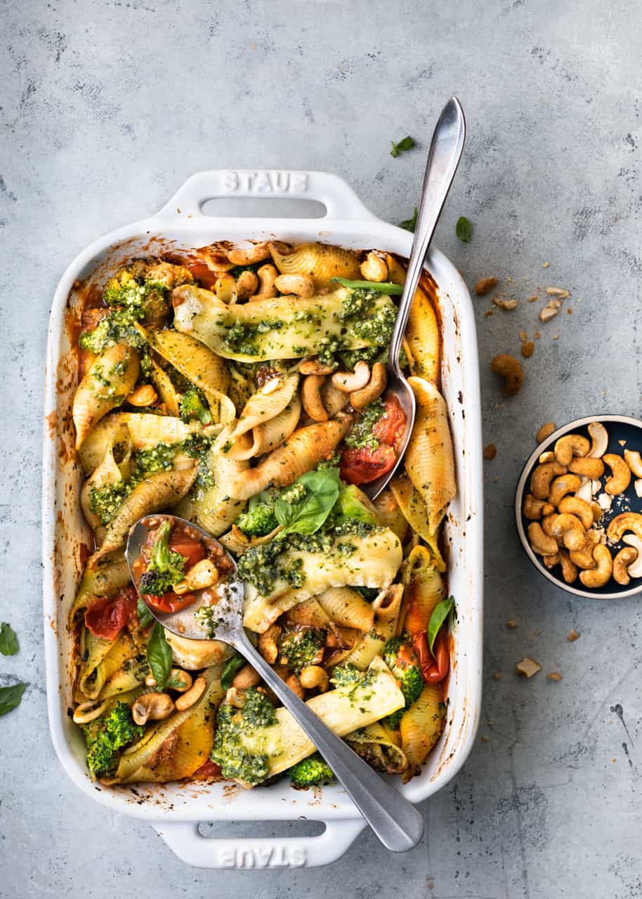 Hak de cashewnoten grof en bestrooi de pastaschotel ermee. Garneer het royaal met basilicum.