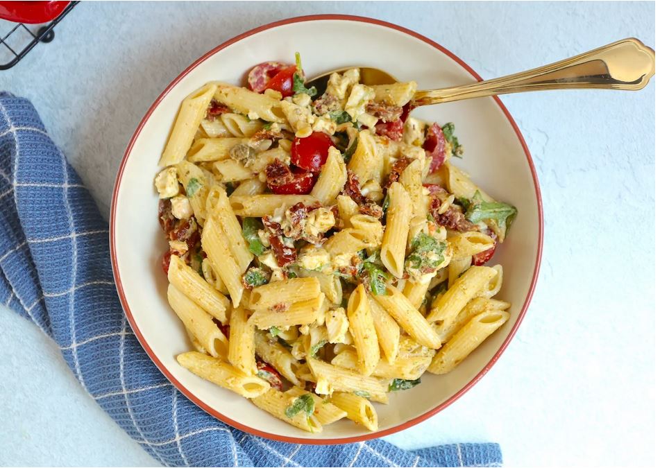 Doe alle ingrediënten in een schaal, wat gescheurde verse blaadjes basilicum erbij, nog een snufje peper eroverheen en de pasta pesto salade kan op tafel.