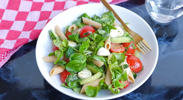 Kook de pasta volgens de aanwijzingen op de verpakking. Doe de sla in een bord of een kom. Halveer de snoeptomaatjes en voeg ze toe. De komkommer snijd je in stukjes, ook deze kan erbij. De basilicum scheur ik in kleine stukjes en ook die voeg je toe aan de salade.