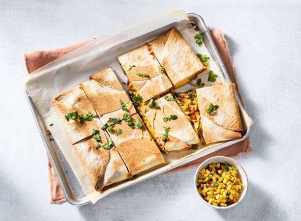 Bestrooi de groente met de kaas. Leg de rest van de tortilla's op het midden van de vulling en vouw de overhangende tortilla's eroverheen. Leg de andere bakplaat erop en bak de quesadilla ca. 20 min. in het midden van de oven.