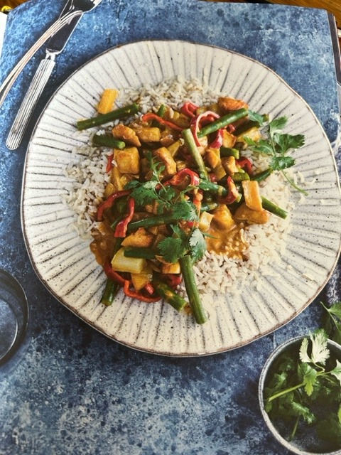 Zet het vuur hoog, voeg de kip toe en bak mooi bruin. Bak de bonen en paprikareepjes kort mee.