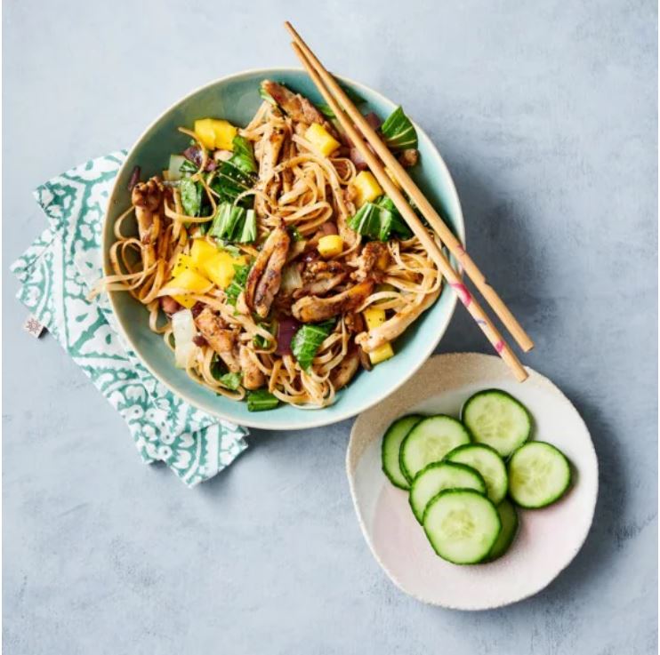 Schep het groene deel van de paksoi door de kip en bak 1 min. op hoog vuur. Voeg de mango toe als de paksoi is geslonken en warm in 2 min. goed door. Giet de noodles af en laat ze goed uitlekken. Voeg ze toe aan de groente en schep door.